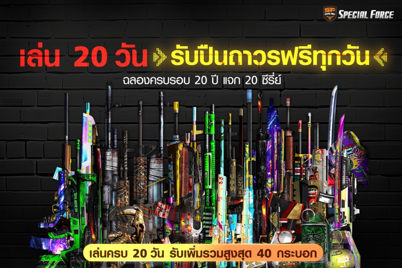 SF ฉลองครบรอบ 20ปี แจกอาวุธถาวรฟรีทุกวัน เข้าเล่นครบ 20วัน รับสูงสุด 40 กระบอก !!