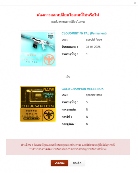 -เมื่อทำการแลกเปลี่ยนแล้วไอเทมดังกล่าวจะหายไป ไม่สามารถนำกลับคืนได้ทุกกรณี