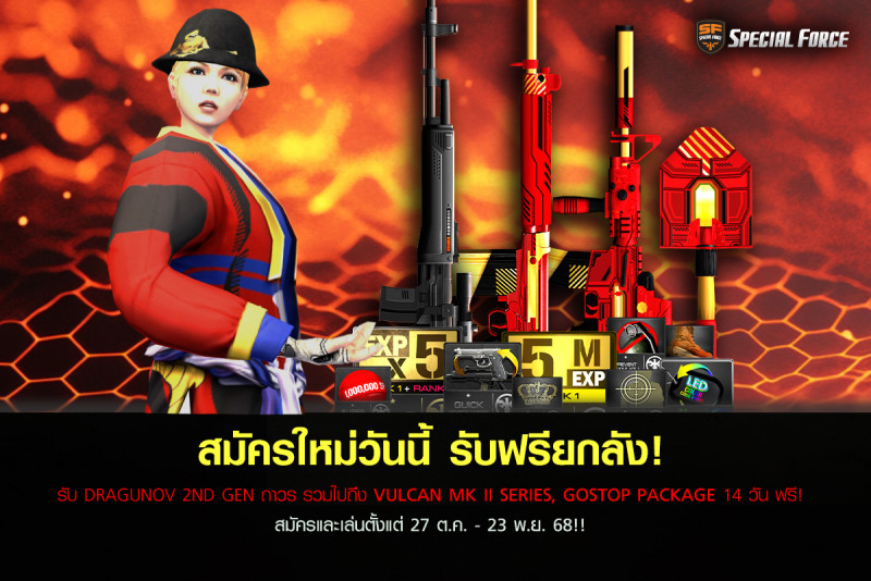 เพียงสมัครไอดีและสร้างตัวละครวันนี้!! (เข้าเกมปั๊บยศอัพทันที) 5,000,000 EXP, อาวุธ DRAGUNOV 2ND GEN, GOSTOP SET PACKAGE และ VULCAN MKll SERIES พร้อมไอเทมสนับสนุนการออกรบอีกเพียบ