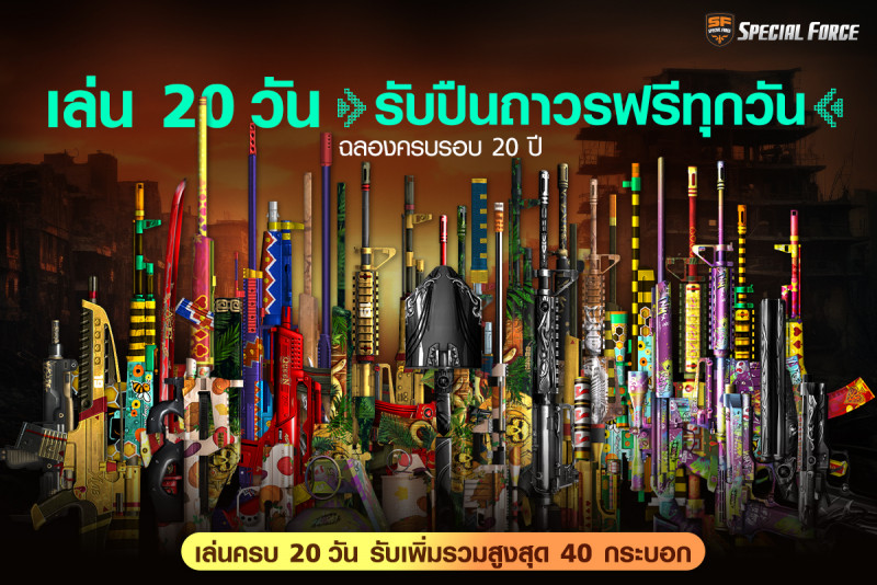 SF ฉลองครบรอบ 20ปี แจกอาวุธถาวรฟรีทุกวัน เข้าเล่นครบ 20วัน รับสูงสุด 40 กระบอก !!