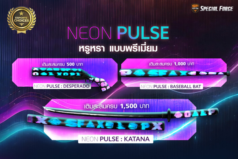 โปรโมชั่นเติมเงินสะสม 500 - 1,500 บาท รับ NEON PULSE คลื่นลำแสงนีออนความเข้มของแสงสว่างเป็นจุดเด่นให้กับตัวอาวุธ